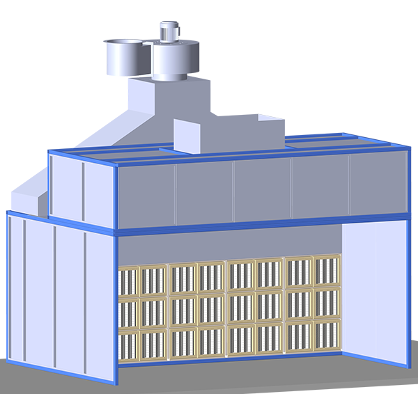 漆霧分離室位于噴涂作業(yè)室的一側(cè),內(nèi)部設(shè)置一排折流式漆霧分離箱??諝鈹y帶過噴的漆霧由噴涂作業(yè)室的一側(cè)進(jìn)入折流式漆霧分離箱,在空氣折流式漆霧分離箱過程中,空氣中的漆霧被分離。潔凈的空氣由漆霧分離箱排出,進(jìn)入分風(fēng)管,而后進(jìn)入主風(fēng)管。